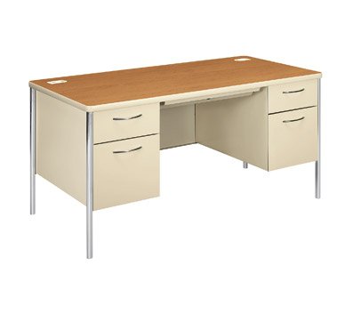 Attractive radius leg design and arched drawer pulls. Material: Steel. Product Type: Straight Desk. Dimensions: 60inch W x 30inch D x 29-1/2inch H. Color / Finish: Harvest/Putty. Ideal for any office. Full-extension tripletied cradles and suspension on all file drawers; high-sided to accept hanging files. 3/4-extension box drawers with 1 divider. 3/4-height modesty panel. Wire-management grommets keep cables neat and off work areas. Locking center drawer with HON � One Key� interchangeable lock. 100% pre-consumer recycled laminate. THE HON LIMITED LIFETIME WARRANTY