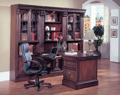 Style: Traditional English Library Materials: Solid Poplar and Maple veneers Leaded glass door inserts with beveled diamond pattern Finish: Multi-step Chestnut w/accent shading and highlights, hand distressing, medium sheen top coat Pieces Included In Package: (2) 32" Glass Door Cabinet (1) 32" Open Top Bookcase (1) 2pc Peninsula Desk Features: * This wall offers the mixed function of Entertainment Center, Home Office or Bookcase Wall * All cabinets are 80" high and offered in various widths to allow for semi-custom installations * All cabinets have locking bolts to connect the cabinets together *Concealed plugs offer a finished end cabinet or may pop-out to connect cabinets together