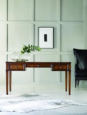 Your work, your room and your home will be enhanced by this exceptional writing desk in hardwood solids with an ash burl border and walnut veneer. Quiet confidence and practical function emanate from this spacious and functional desk.Two utility drawers on metal ball bearing guidesWriting insert that can be used on either sideOne center drawer with drop-front for use with a keyboardLevelers