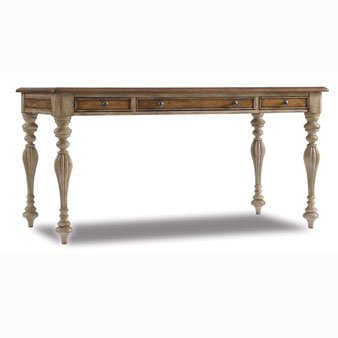 Your work, your room and your home will be enhanced by this exceptional writing desk in hardwood solids and ash veneers. Quiet confidence and practical function emanate from this spacious and functional desk.Center leather writing surfaceOne center drawer with drop-frontTwo utility drawers with writing insert that can be used on either side